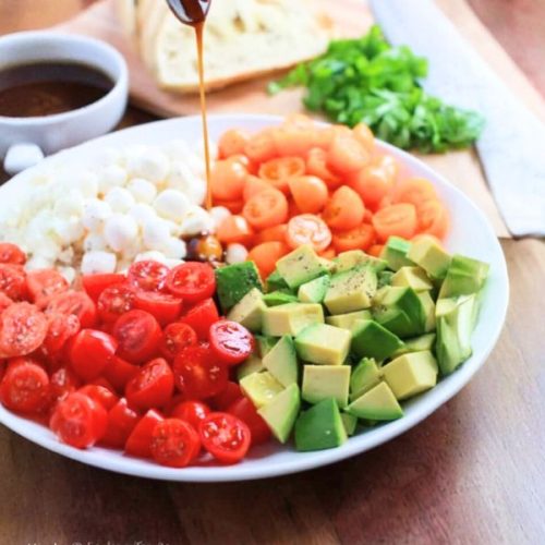 You can prep most ingredients ahead of time — slice the tomatoes, cut the basil, and drain the mozzarella — but wait to cube the avocado and dress the salad until right before serving to maintain freshness.