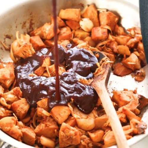 - To achieve a pulled pork-like texture, shred the jackfruit with two forks while it simmers.
