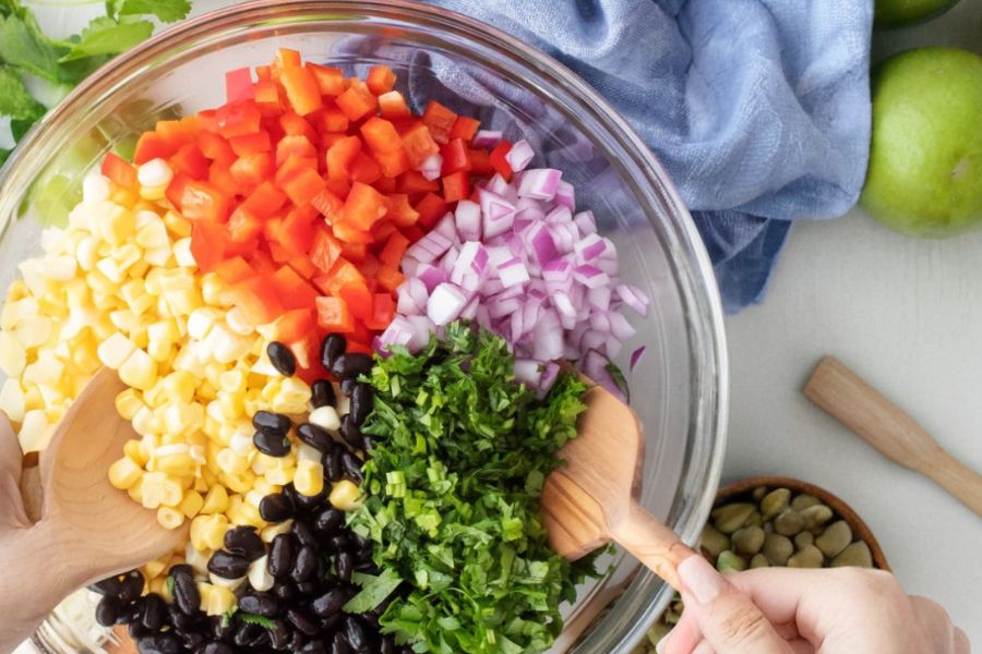 - Combine the Salad Base: In a large mixing bowl, add the rinsed black beans and thawed corn kernels. Gently fold in the diced avocado, chopped red bell pepper, tomatoes, sliced green onions, and fresh cilantro until evenly distributed.