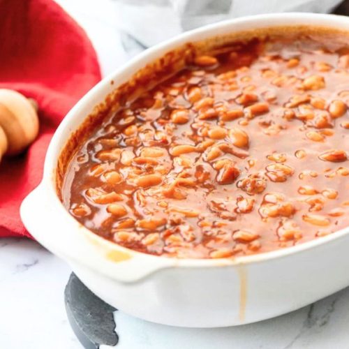This classic baked beans recipe shines with its perfect balance of sweet and savory flavors, thanks to the blend of maple syrup, molasses, and brown sugar combined with smoky bacon and tender navy beans.