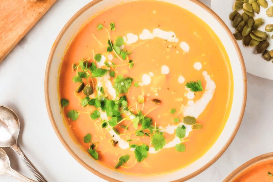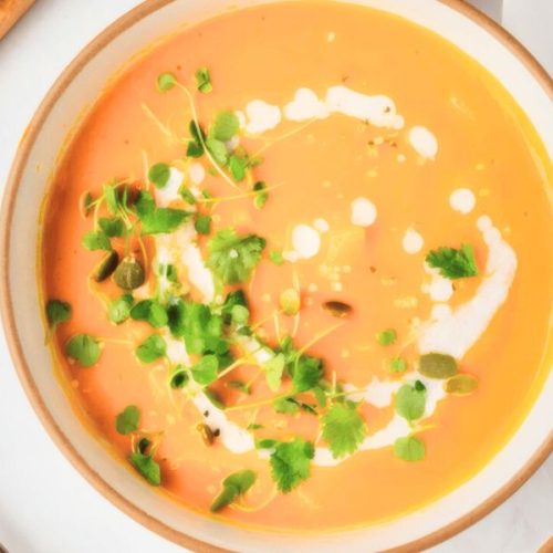 - Adjust Sweetness and Serve: Taste the soup and, if desired, stir in the maple syrup to balance flavors with a touch of sweetness. Ladle into bowls and garnish with a swirl of coconut milk for added richness and a beautiful finish. Serve warm and enjoy!