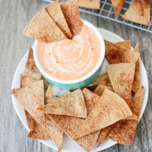 - The cinnamon sugar tortilla chips add a delightful crunch but the dip is equally delicious with fresh fruit or simple crackers.