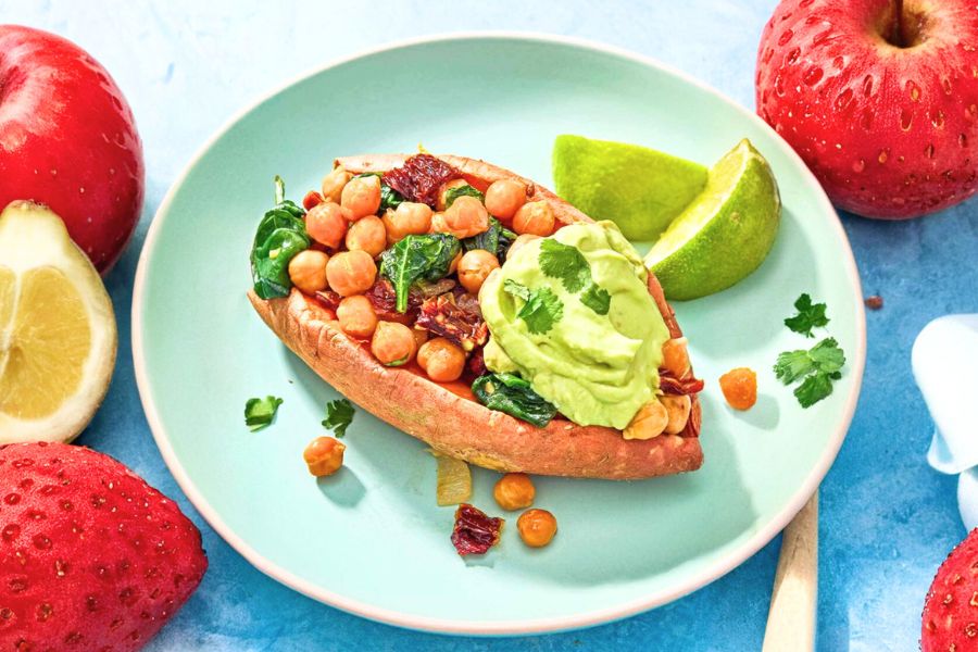 The combination of roasted sweet potatoes with a warm chickpea, sun-dried tomato, and spinach filling offers a satisfying balance of fiber and plant-based protein, making it ideal for sustained energy.