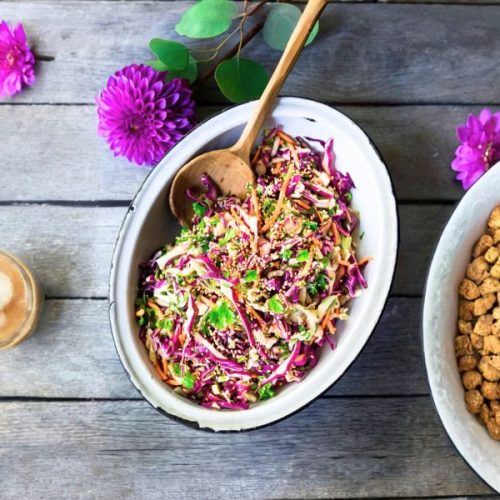 - This slaw is naturally vegan but can be made gluten-free by swapping soy sauce for tamari or coconut aminos.