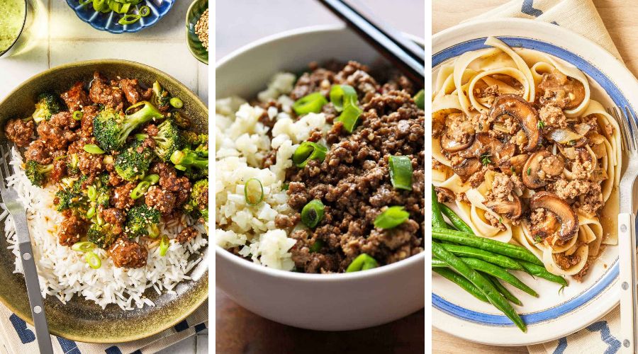 • Heat olive oil in a skillet and cook plant-based ground beef with onions until browned.