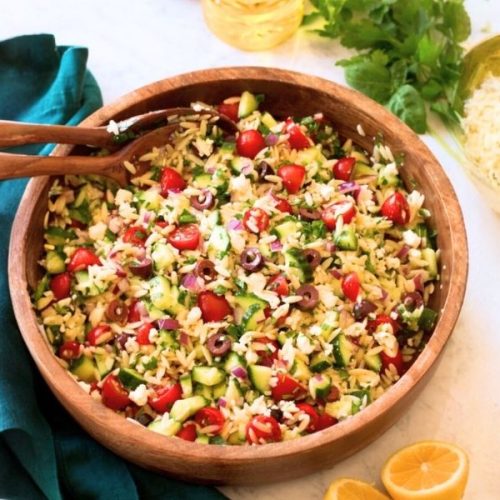The combination of orzo pasta, chickpeas, cucumbers, tomatoes, and feta creates a satisfying meal that’s rich in plant-based protein, fiber, and healthy fats from olive oil.