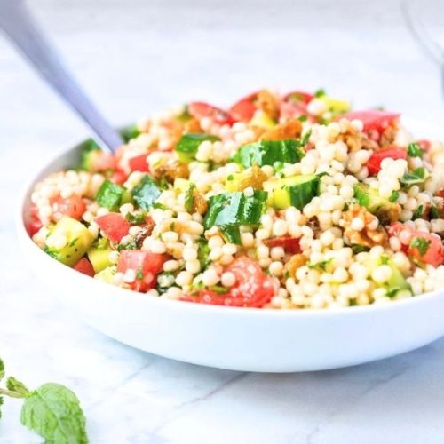 Using pearl couscous instead of regular couscous creates a pleasantly chewy, pearl-like bite that holds dressing well without becoming mushy.