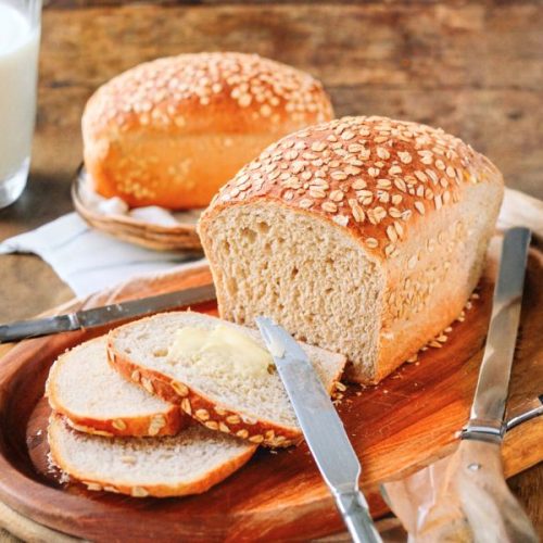 - Shape & Prepare Loaves: Grease two 9×5-inch loaf pans generously with butter. Divide the dough into two equal portions. Roll each portion into a loaf shape, keeping the top smooth. Lightly brush the tops with water and roll them over rolled oats to coat. Place each loaf, oat-side up, in the prepared pans. Cover and let them rise for the final 60 minutes, until puffy and nearly doubled.