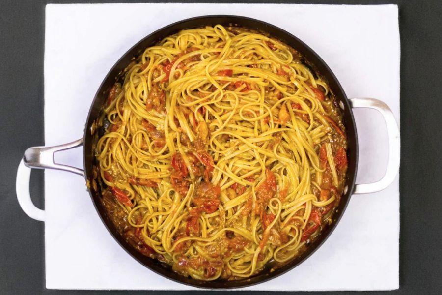 - Combine Pasta and Sauce: Add the drained linguine to the sauté pan with the tomato-pesto mixture. Toss thoroughly, using a splash of the reserved pasta water if the sauce feels too thick. Continue tossing over low heat until the pasta is evenly coated and glossy.