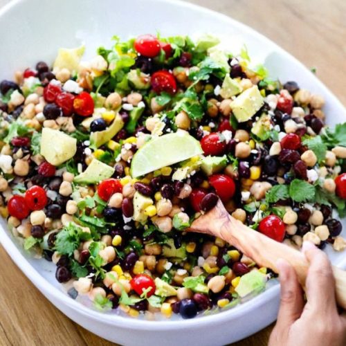 The mix of chickpeas, black beans, corn, and avocado provides a plant-based protein boost while keeping the dish fiber-rich, which helps promote digestion and keeps you feeling full longer.