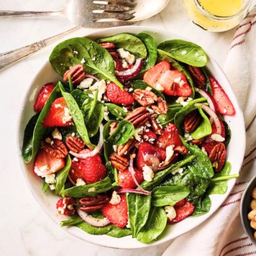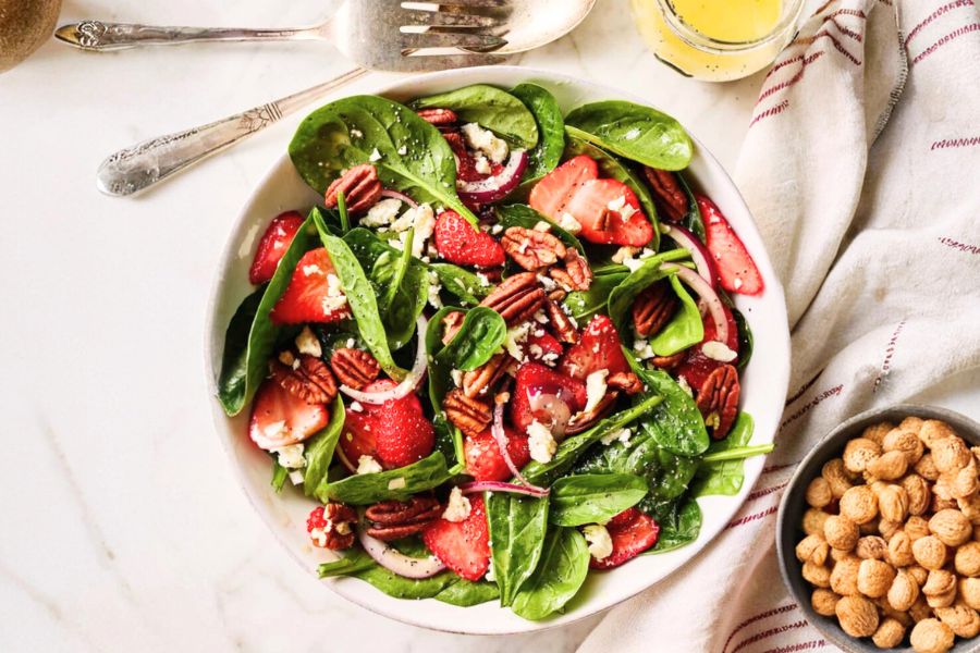 It’s fiber-rich from fresh spinach and strawberries, while pecans provide heart-healthy fats and a touch of plant-based protein.