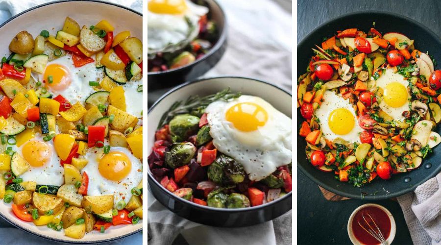 This breakfast bowl combines sautéed vegetables with soft scrambled eggs for a nourishing Sunday meal.