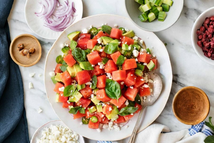 The crisp watermelon hydrates and cools, while creamy feta and avocado provide a rich source of healthy fats and a small boost of protein.