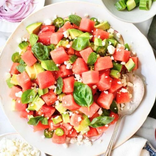 Yes! You can prep the watermelon, cucumber, and onion a few hours in advance and store them in the fridge. Add feta, avocado, herbs, and dressing right before serving for the freshest taste and texture.