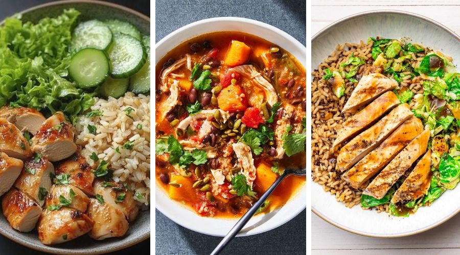 - Layer quinoa, roasted sweet potatoes, and grilled chicken in a bowl.